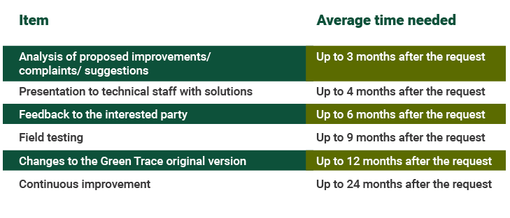 We have therefore provided a space below where our business partners, suppliers and/or other interested parties can share situations where they feel negatively impacted by GREEN TRACE, its practices and standards in force, such as the processes and results of periodic verifications and validation audits.